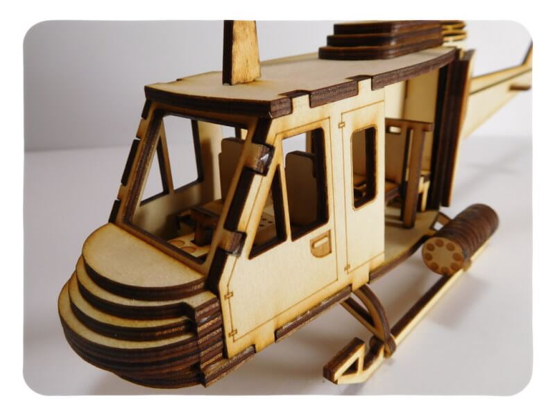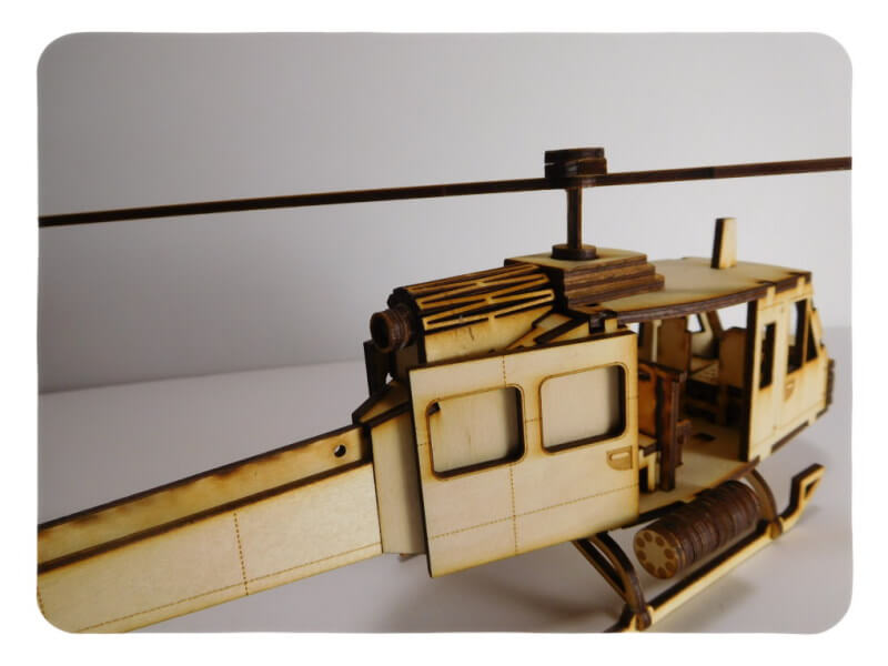 This Huey offers a very realistic and detailed look, the rear propeller spins and the gun rotates to offer a full spin feel! The Huey is made of Plywood giving it a great rustic look, but if you want, you can paint it. We suggest using wood glue or regular white craft glue; do not use a glue gun, gorilla glue, epoxies, or instant glues. This model takes about 1-2 hours to build. All our LazerModels are Laser Cut in house and that allows us to proudly say “Made in the United States of America”.